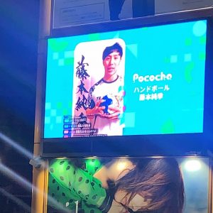 現役ハンドボール選手の藤本純季選手のお名前を書かせていただきました。配信サイトポコチャの中で渋谷ポコクロックというイベントで優勝された際の映像が渋谷区で流れました。